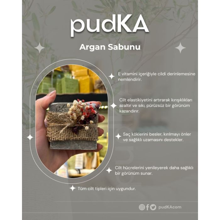pudKA Argan Soap, enriched with argan oil, moisturizes the skin with its vitamins and minerals, supporting cell renewal. With its anti-aging effect, it helps keep the skin youthful and reduces wrinkles. It is rich in vitamin E and natural fatty acids. It also soothes irritation on sensitive skin, providing relief.